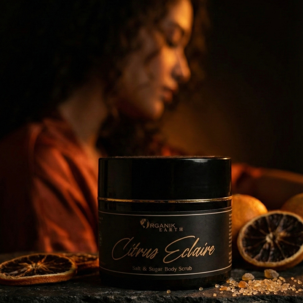 Citrus Éclair is a revitalising salt and sugar body scrub designed to refresh the skin and awaken the senses. Fine sugar crystals gently polish away dead skin cells while mineral salt helps cleanse and detoxify the skin. Infused with uplifting citrus extracts, this scrub restores skin’s natural softness and glow while delivering a burst of freshness with every use. The result is skin that feels clean, smooth, and naturally radiant—never dry or tight.