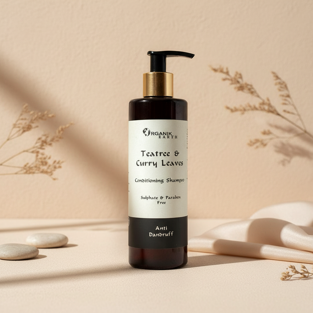 Tea tree & Curry leaves conditioning shampoo, sulfate and paraben free, effectively treats dandruff. Tea tree oil’s antifungal properties soothe the scalp, reduce itchiness, and prevent dandruff. Curry leaves strengthen hair follicles, reduce hair fall, and promote healthy scalp. Together, they cleanse and nourish the scalp, leaving hair dandruff-free and healthy.