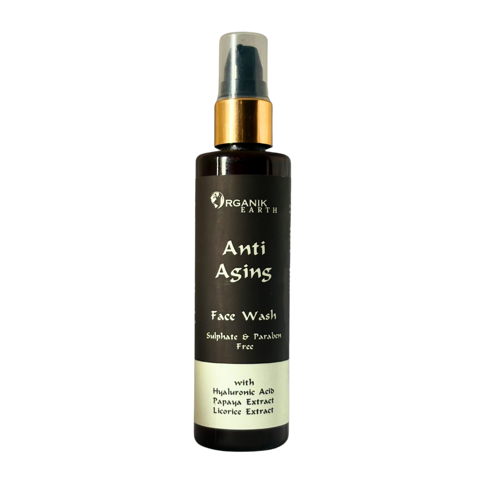 The sulfate and paraben-free Anti-aging facewash with Hyaluronic Acid, Papaya Extract, and Licorice Extract rejuvenates the skin. Hyaluronic Acid hydrates, Papaya Extract exfoliates, and Licorice Extract brightens. Aloe Vera soothes, Vitamin C boosts collagen, and Green Tea Extract protects, revealing youthful, radiant skin.