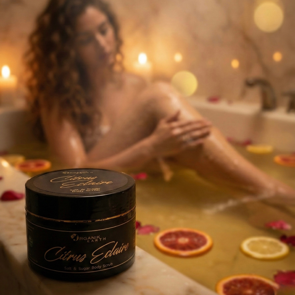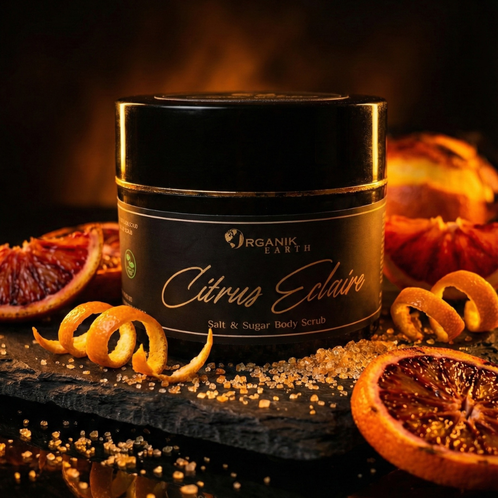 Citrus Éclair is a revitalising salt and sugar body scrub designed to refresh the skin and awaken the senses. Fine sugar crystals gently polish away dead skin cells while mineral salt helps cleanse and detoxify the skin. Infused with uplifting citrus extracts, this scrub restores skin’s natural softness and glow while delivering a burst of freshness with every use. The result is skin that feels clean, smooth, and naturally radiant—never dry or tight.
